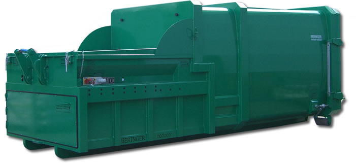 Eine schwere und stabile Bauart zeichnet alle BERINGER Reducer aus. Presskasten und Presskolben sind Schweißkonstruktionen aus Stahlbauhohlprofilen in Verbindung mit UNP + INP – Trägern. Der angebaute Stauraum ist grundsätzlich aus gewölbten Blechen hergestellt, um bei niedrigem Eigengewicht größte Stabilität und Verwindungsfreiheit zu garantieren. Die konische Bauart des Stauraums gewährleistet eine optimale Entleerung ohne fremde Hilfe. Das leise Hydraulikaggregat ist bei allen Typen sicher vor Beschädigungen und wartungsfreundlich im vorderen Presskasten untergebracht. Es ist auf Silentblöcken gelagert, die Ölablassschraube ist nach außen verlagert und das Ölschauglas von außen einsehbar. Grundsätzlich sind unsere Pressaggregate mit einem Ölmangelschalter ausgestattet und schalten somit bei Ölverlust selbstständig ab.