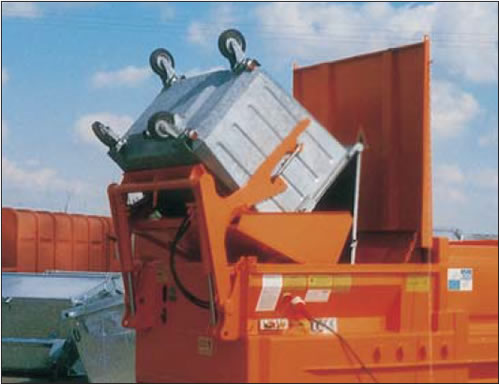 können an jeden Selbstpressbehälter der Typen reducer x4 angebaut werden. Die Hydraulik wird mit dem Aggregat der Presse versorgt, daher ist die HKV immer einsatzbereit. Durch den Betrieb der HKV wird der Pressvorgang nicht gestoppt. Standardhub-Kipp-Vorrichtungen können Gefäße von 80 bis 1100 l Inhalt auf nehmen, wahlweise über Seitenzapfen oder Kamm aufnahme. Selbstverständlich stehen auch Sonderkonstruktionen für größere Behälter zur Verfügung!